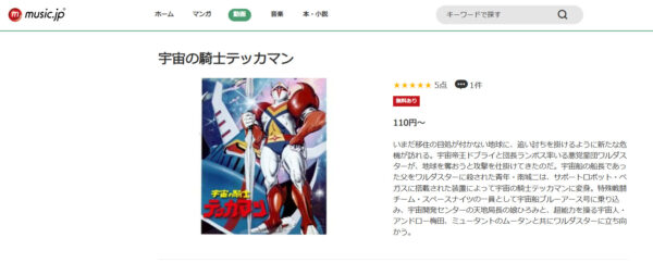 アニメ「宇宙の騎士テッカマン」の動画は視聴できませんが、月額500円と安いコストパフォーマンスが好評です。