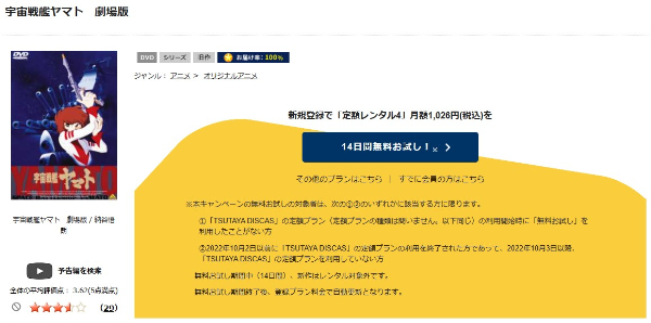 『TSUTAYA DISCAS』は初回特典で14日間の無料期間があり、お試しで利用できるので「宇宙戦艦ヤマト」の動画をフルで無料視聴できますよ。