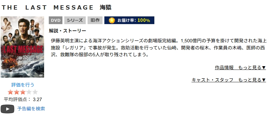 そして、映画「THE LAST MESSAGE 海猿」は、ツタヤディスカスにて、旧作で配信してるのでレンタルすることができます。