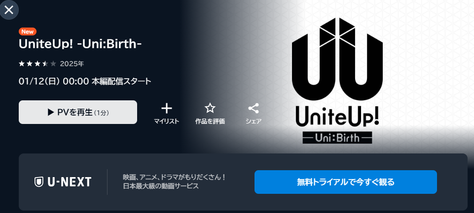 2025年1月11日(土)から新しくスタートするアニメ「UniteUp! -Uni:Birth-」の動画を無料トライアルで全話視聴できる配信サイトを紹介します。
