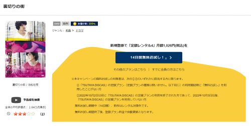 『TSUTAYA DISCAS』は14日間のお試し期間が初回特典で利用できるので「裏切りの街」の動画をフルで無料視聴できますよ。