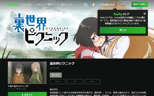 Huluでアニメ「裏世界ピクニック」の動画を全話視聴
