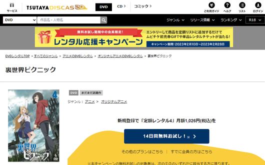 TSUTAYA DISCASは、準新作は8枚まで、話題作・旧作は枚数制限なしでお試し期間中に無料レンタルができ「裏世界ピクニック」のアニメは、旧作なので無料視聴可能です。