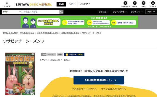 TSUTAYA DISCASは、準新作は8枚まで、話題作・旧作は枚数制限なしでお試し期間中に無料レンタルができ「ウサビッチ シーズン3」のアニメは、旧作なので無料視聴可能です。