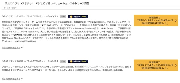 動画配信サービスとは少し違い、DVDレンタルサービスになりお試し期間で、「うたの☆プリンスさまっ♪ マジLOVEレボリューションズ(第3期)」の動画を全話視聴することができます。