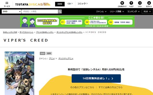 TSUTAYA DISCASは、準新作は8枚まで、話題作・旧作は枚数制限なしでお試し期間中に無料レンタルができ「VIPER’S CREED」のアニメは、旧作なので無料視聴可能です。