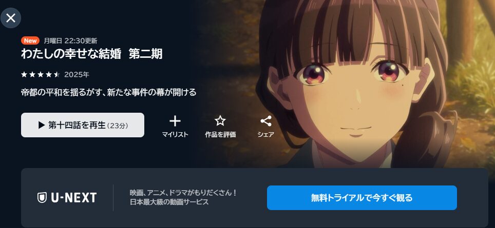 先に結論をお伝えすると、アニメ「わたしの幸せな結婚 2期」は、『U-NEXT』の動画配信サイトで無料トライアル期間中に全話視聴が可能です。