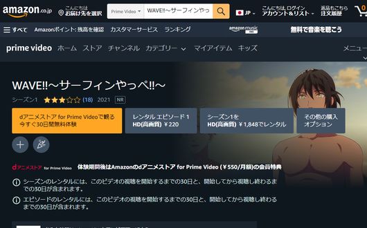 Amazonプライムはアニメ「WAVE!!~サーフィンやっぺ!!~」は無料で視聴できませんが、関連動画やシリーズ作品には見放題で配信されているものもあります。
