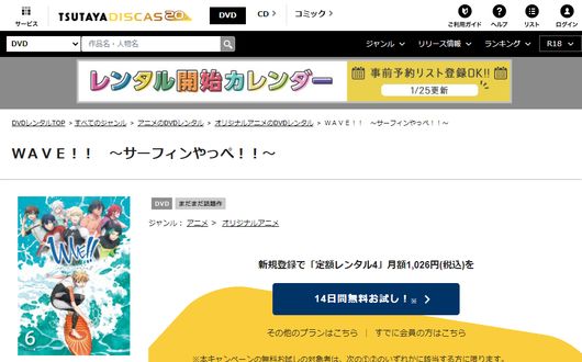 TSUTAYA DISCASは、準新作は8枚まで、話題作・旧作は枚数制限なしでお試し期間中に無料レンタルができ「WAVE!!~サーフィンやっぺ!!~」のアニメは、話題作なので無料視聴可能です。
