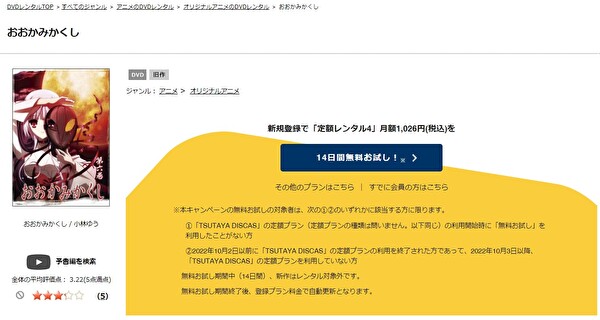 TSUTAYA DISCASは、準新作は8枚まで、話題作・旧作は枚数制限なしでお試し期間中に無料レンタルができ「おおかみかくし」のアニメは、旧作なので無料視聴可能です。