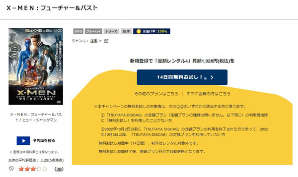 TSUTAYA DISCASは14日間無料期間があるので、そのお試し期間を利用することで映画「X-MEN:フューチャー&パスト」を無料視聴することができるのです。
