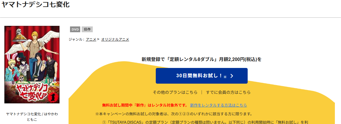 『TSUTAYA DISCAS』は初回登録限定で無料お試し期間があるため、その期間を利用すれば、アニメ「ヤマトナデシコ七変化」を実質無料で全話視聴できますよ。