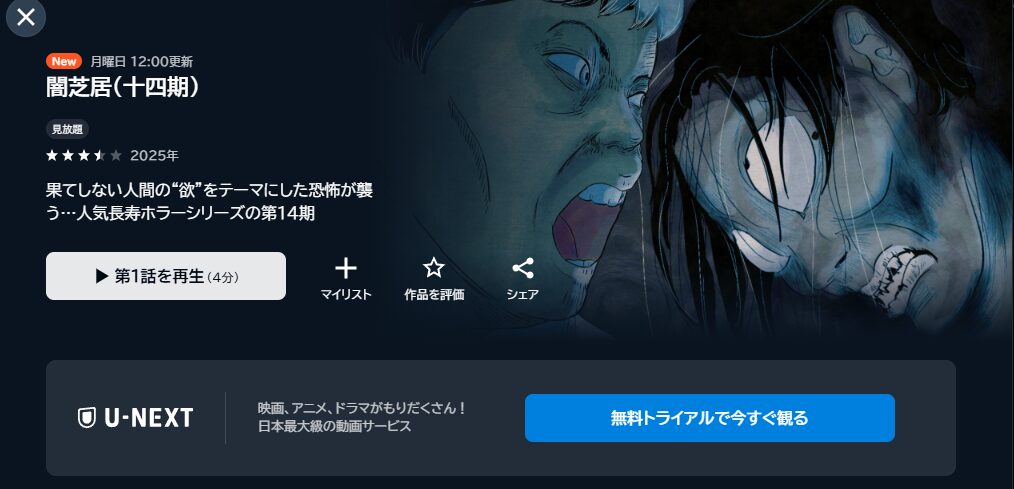 先に結論をお伝えすると、アニメ「闇芝居 十四期」は、『U-NEXT』の動画配信サイトで無料トライアル期間中に全話視聴が可能です。