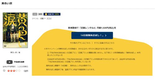 『TSUTAYA DISCAS』は14日間のお試し期間が初回特典で利用できるので「黄色い涙」の動画をフルで無料視聴できますよ。