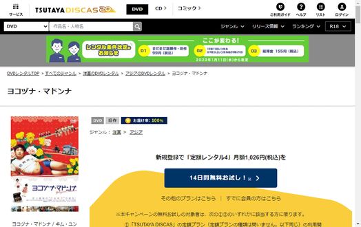 『TSUTAYA DISCAS』は14日間のお試し期間が初回特典で利用できるので「ヨコヅナ・マドンナ」の動画をフルで無料視聴できますよ。