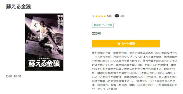 映画「蘇える金狼(1979)」は220円でレンタル配信してるので、フルで視聴できます。
