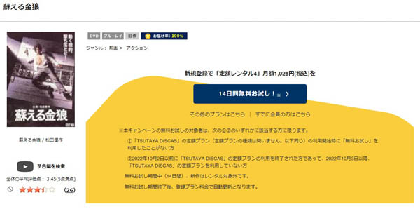 そして、映画「蘇える金狼(1979)」はツタヤディスカスで配信しているので、無料でDVDレンタルが可能です。