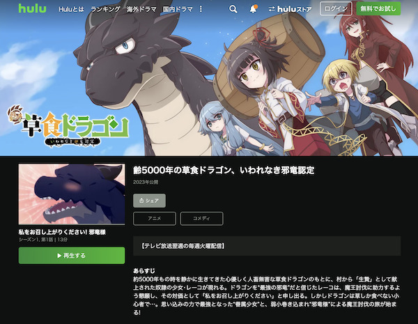 Huluでアニメ「齢5000年の草食ドラゴン、いわれなき邪竜認定」の動画を全話視聴