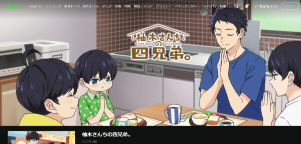 動画配信サイトHuluでは2024年11月現在、アニメ「柚木さんちの四兄弟。」の1話~最終話(12話)が配信中となっており、フルで視聴が可能です。