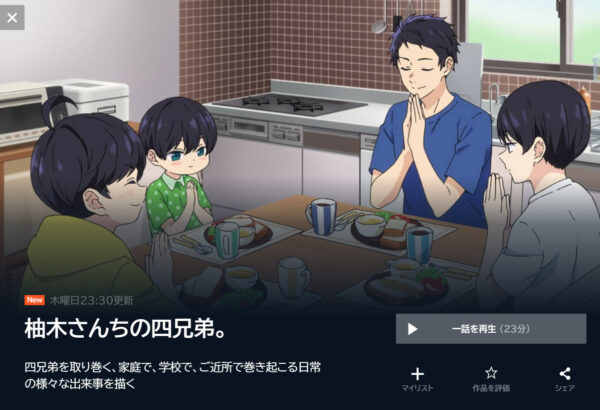 初回のみ初月無料のお試し期間があり、2024年11月現在、アニメ「柚木さんちの四兄弟。」の1話~最終話(12話)が配信中となっており、フルで視聴が可能です。