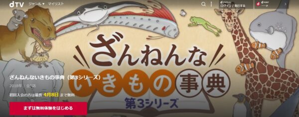「ざんねんないきもの事典 第3シリーズ」のアニメは、dTVで全話配信してるので無料視聴ができます。