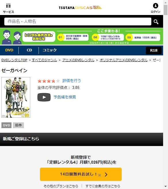 TSUTAYA DISCASは、準新作は8枚まで、話題作・旧作は枚数制限なしでお試し期間中に無料レンタルができ「ゼーガペイン」のアニメは、旧作なので無料視聴可能です。