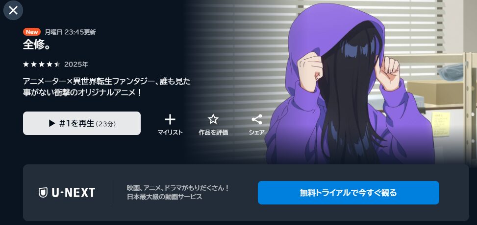 U-NEXTでアニメ「全修。」の動画を無料トライアルで全話視聴