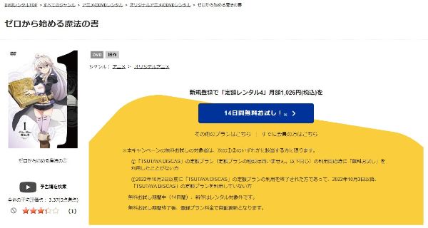 TSUTAYA DISCASは、準新作は8枚まで、話題作・旧作は枚数制限なしでお試し期間中に無料レンタルができ「ゼロから始める魔法の書」のアニメは、旧作なので無料視聴可能です。