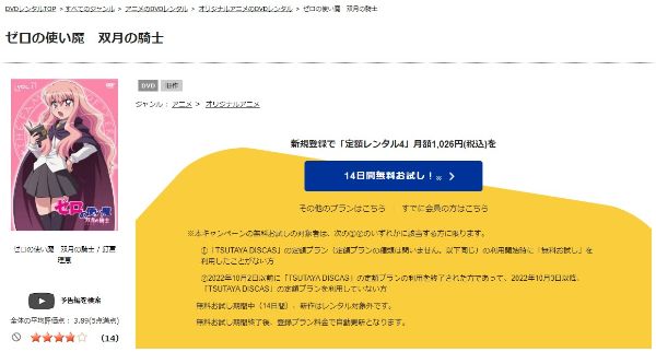 TSUTAYA DISCASは、準新作は8枚まで、話題作・旧作は枚数制限なしでお試し期間中に無料レンタルができ「ゼロの使い魔〜双月の騎士〜(2期)」のアニメは、旧作なので無料視聴可能です。