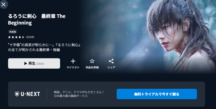 結論からお伝えすると、映画「るろうに剣心」は『U-NEXT』で動画をトライアル期間中にフルで視聴することが可能です。