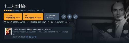 しかし、映画「十三人の刺客(1963)」はレンタル作品のため、300円かかってしまい無料視聴することができません。