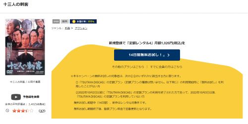 そして、映画「十三人の刺客(1963)」はツタヤディスカスで配信しているので、無料でDVDレンタルが可能です。