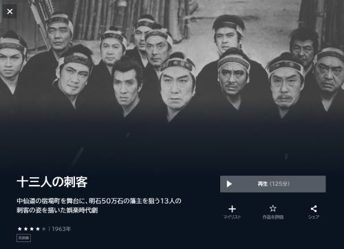 ただ、映画「十三人の刺客(1963)」の関連作品の映画は配信しているので、見放題で視聴は可能です。